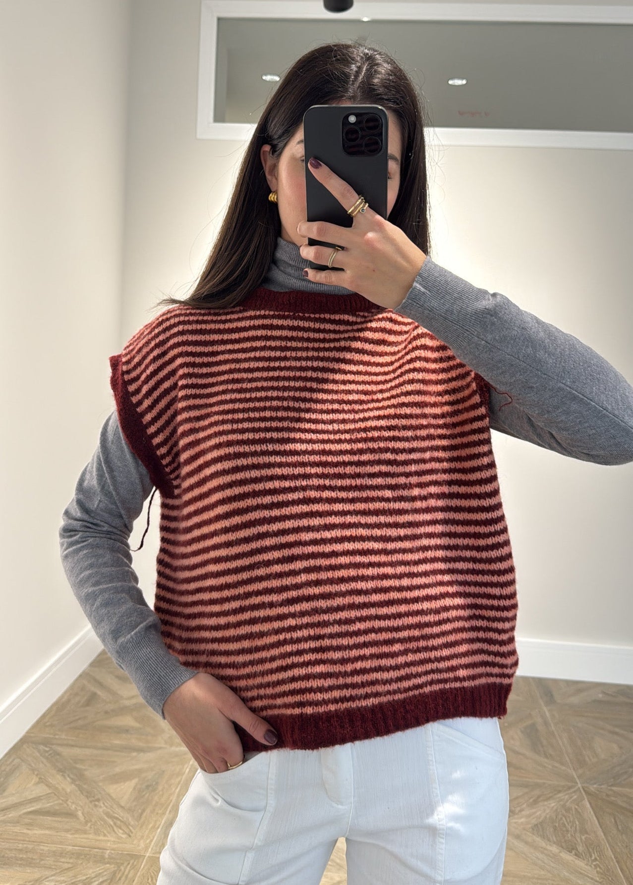 CHALECO PUNTO RAYAS BURDEOS Y SALMON